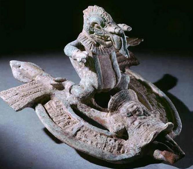 Cerámica típica maya, de tumbas elite. El "casco" es un yelmo de jaguar o