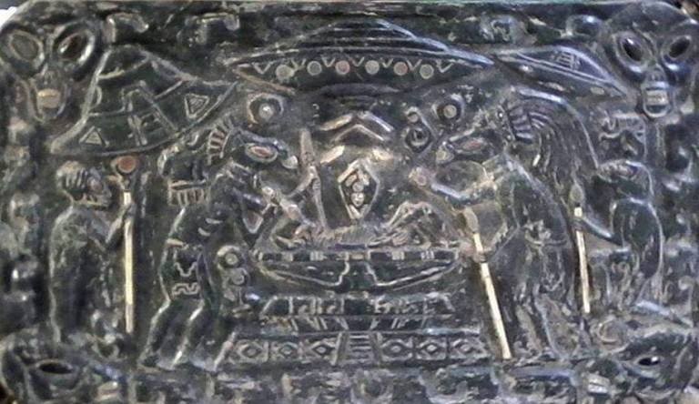 con piedras de valor, representa una escena de la antigua cultura precolombina relacionada