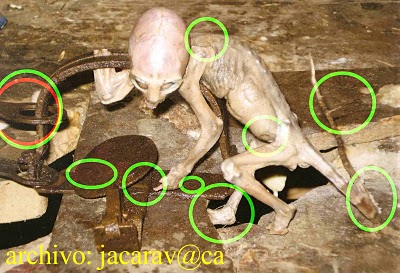 El pequeño ser atrapado vivió unas 30 horas aproximadamente hasta que, tras ser sumergido en repetidas ocasiones en el agua, acabó ahogado. Momentos después fue introducido en un liquido para curtir pieles con la intención de conservarlo. Para los amantes de los misterios se dió una trágica circunstancia añadida que aún añadió mayor incógnita a todo el incidente. El Sr Mario Moreno López, dueño de la explotación fue asesinado en el interior de su auto en julio de 2007, su cadáver apareció completamente carbonizado. No fueron pocas las voces que aseguraban sin pudor, que el trágico final del Sr. Moreno estaba ligado al hallazgo de la inquietante criatura. ¿Se trataba de una nueva especie desconocida por la ciencia?, ¿un ser extraterrestre?, ¿tal vez una cría del temido chupacabras?... o simplemente se trataba de un sencillo engaño.... las preguntas se amontonaban ante la visión del paradigmático animal que fue conservado con el cepo que lo llevó hasta la muerte...