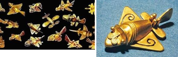 parecen "aviones" con alas, cola y fuselaje; están en el Museo del Oro de